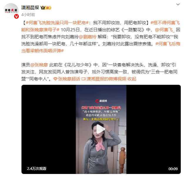 (来源:潇湘晨报) 10月25日,在近日播出的综艺《一路繁花》中,何赛飞因找不到肥皂而焦虑并向刘嘉玲解释:“我要卸妆,没有肥皂不能卸妆”“我洗脸洗澡都用一块肥皂,几十年都这样”。刘嘉玲对此露出震惊表情。 演员张晚意此前在《花儿与少年》中,因“一块香皂解决洗头、洗澡、卸妆”引发关注,网友发现两人曾饰演母子,戏外习惯高度一致,被调侃为“三合一肥皂同盟”“同皂中人”。